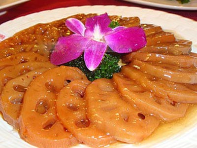 嫩藕400克,红椒丝5克。 盐1.5克,糖50克,果珍30克。