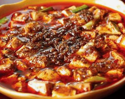 材料:豆腐10两(约400克)、牛肉末、青蒜苗段、豆豉、豆瓣、辣椒粉、花椒粉、盐、酱油各适量。
