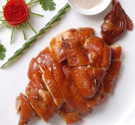 1. 将5只肥嫩公鸡(约4000克)宰杀煺毛除去嗉袋、内脏洗净,放入清水中烫泡一下捞出,控净水分晾干;