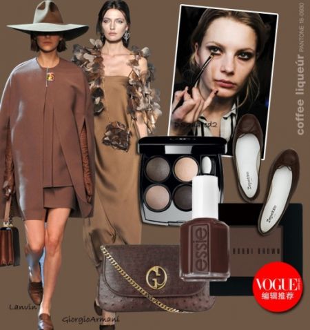 导语:色彩趋势单从色卡上看单调又乏味,用时装和彩妆来诠释则形象得多。就像Pantone发布的2011秋冬流行色之一的夹竹桃紫(Phlox),今天我们要另外一款秋冬流行色:深咖色(coffee liqueur 18-0930)。这是一款混合了泥土和浓咖啡色泽的色调。