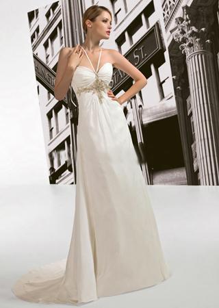 这款婚纱的肩带是一个亮点,细细的意式肩带在前胸还是时尚的系领设计,但是到了背后就变成了X形状的交替系带设计,前胸的细密的金色亮钻更是为这款婚纱增添了几分贵族的气息,后背交带的中心也是用金色的亮钻修饰,后腰的收腰设计和裙摆的自然状态让这款婚纱显得充满高贵气息。
