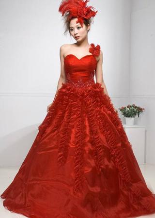 高调的颜色使得新娘在婚礼上绝对是众人眼中的焦点,这款婚纱的款式在设计上也是别具一格,简单的抹胸高贵大方,腰间的亮色珠片显得这款婚纱的档次,裙摆的微蓬型的设计也凸显了新娘的可爱气质。