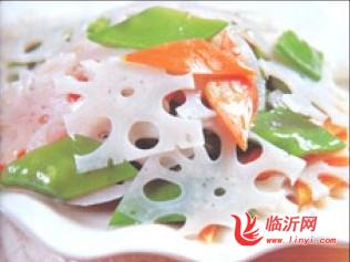 3、锅热后放油烧至7成热,放葱、姜、蒜末煸炒出香味,放入焯好的藕片、胡萝卜片及荷兰豆,加醋、花椒油、盐、味精稍炒出锅。