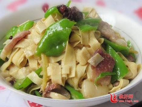 3、锅烧热油,下葱花、干椒丝略炒,放入豆腐皮,加蚝油、酱油、味精等调料炒匀,淋花椒油,出锅即成。