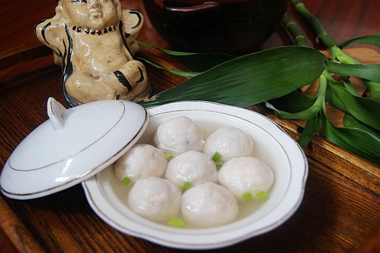 16.撇去浮沫后改中小火汆至鱼丸刚熟透,盛入汤碗,撒上少许葱末、胡椒粉、香油即成。