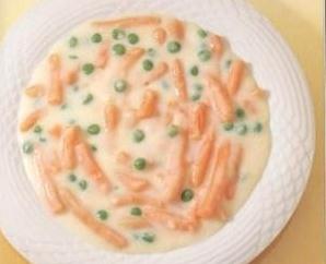 3)先烧热牛油 3汤匙,下面粉炒拌至散出香味,加牛奶,搅拌均匀,注意不要烧焦,以盐,胡椒粉调味,即成白汁;
