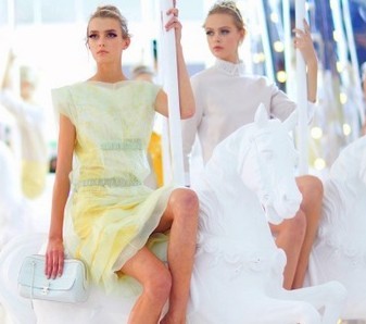 路易·威登(Louis Vuitton) 2012春夏秀场宛如童话仙境,模特们坐在大型旋转木马上缓缓来开帷幕。模特们得妆容精致,嫩白的好像芭比娃娃。