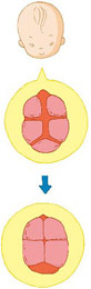 胎儿的头骨会自动调整,产妇分娩时,胎儿在通过产道的时候,一边回转,一边收起下巴,在努力地试图通过产道。胎儿的头骨很软,并且还会在通过产道的时候自动拼合,胎儿正是因为这样柔软的头盖骨,才得以避免因挤压而造成的永久性伤害,而顺利地把头钻出产道——这也是我们常常看到的新生儿是“ 尖脑袋”原因。