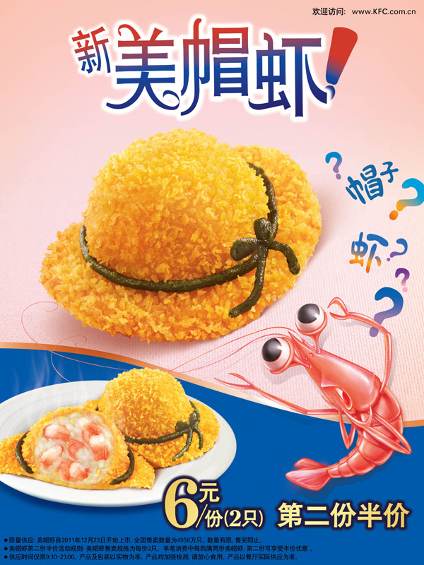 •活动介绍: 肯德基又推新品-美帽虾! 6元/份(2只) 第二份半价