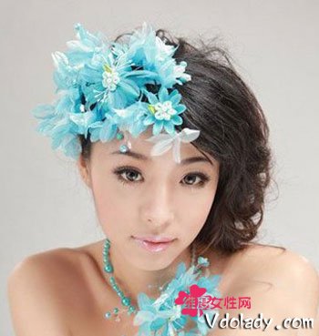 宝蓝色花朵和珠链发饰点缀在发侧和盘发上,高贵迷人。