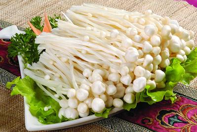 形态优美的金针菇是食药兼用蕈菌,味道鲜美,且含有丰富的蛋白质、粗纤维、B族维生素等。金针菇中的赖氨酸和精氨含量特别丰富,且含锌量较高,两者都能促进儿童的智力发育和成长。