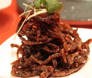 2.锅置旺火上烧热,加入豆油,烧至油温约200℃时,放入鳝肉,炸约3分钟捞出,待油温复升至200℃时,复放鳝肉,炸约4 分钟,再用小火炸脆;另取炒锅置旺火上烧热,舀入豆油25 克,加葱、姜末煸香,加黄酒、酱油、白糖烧沸成卤汁,即捞起炸脆的鳝肉,放入卤汁内颠翻,淋麻袖出锅装入盘内,成宝塔形,上用姜丝作点缀即成。此菜形态美观,色呈酱褐色,鳝肉松脆香酥,卤汁甜中带咸。