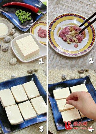 南豆腐一块,猪肉馅一小块。青豆一小把,红椒一个,姜一小块,鹌鹑蛋数个,熟猪油一勺