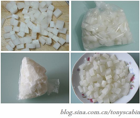 5.第二天把冷冻好的萝卜丁拿出放在盘里让其融解,溶解好之后呢就根据你自己所要做的菜随性发挥吧。
