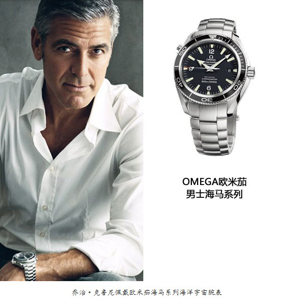 奥斯卡著名影星兼导演的乔治·克鲁尼是欧米茄的名人大使,他所佩戴的同样是欧米茄海马系列的海洋宇宙手表,时尚的设计完美的演绎了三款经典的款式,更是令这款海洋宇宙独具光芒,所有机芯经镀铑处理及螺旋式打磨,并饰以日内瓦波纹及镀金雕刻,而密封的全钢底盘刻有表名海洋宇宙、欧米茄标志及象征海马系列的海马浮雕。