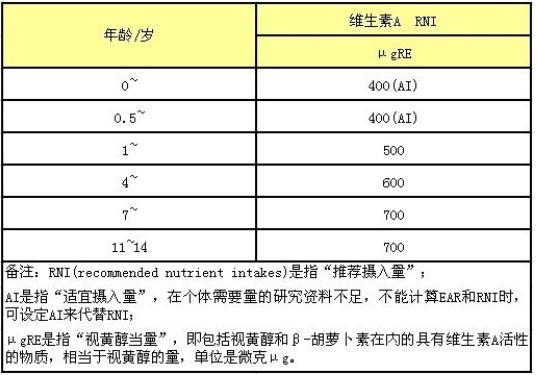 中国营养学会编著的《中国居民膳食营养素参考摄入量》一书,对0-14岁年龄人群对维生素A的每日参考摄入量(DRIs)如下: