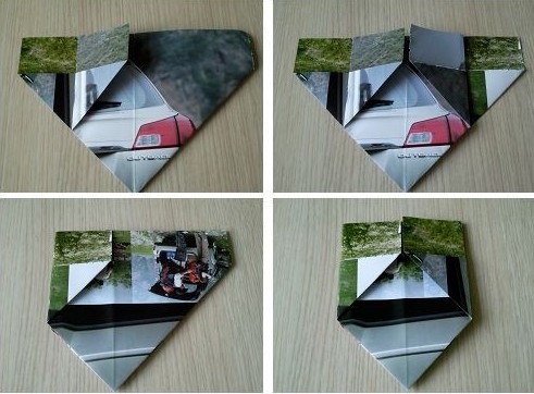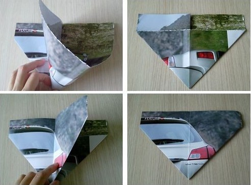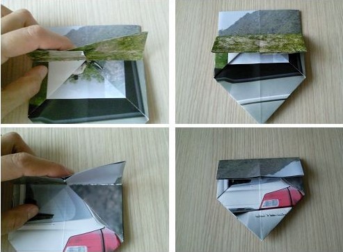 4.依次把左上角和右上角都折到中线位置,翻面做同样的动作