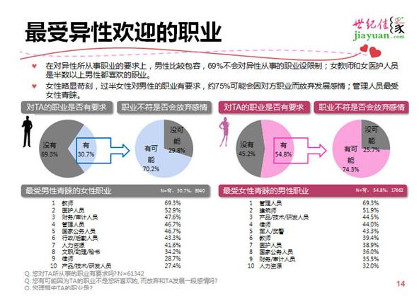 同时在受异性欢迎职业中,教师、财务/审计人员、国家公务人员、人力资源都成为男女共同青睐的前十职业。
