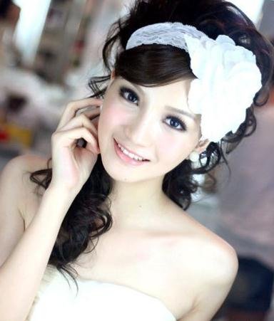 蕾丝发带和白纱花朵组成的新娘发饰点缀新娘卷发,甜美纯真