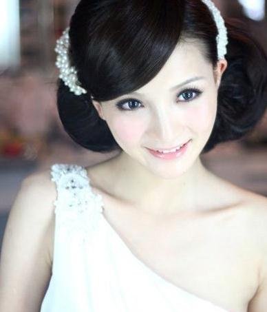 珍珠发饰搭配韩式新娘盘发,斜边刘海更添典雅气质