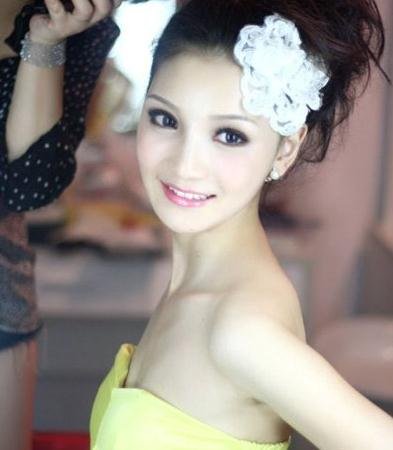 蕾丝刺绣花朵发饰点缀在新娘发侧,蓬松盘发搭配黄色抹胸礼服性感十足