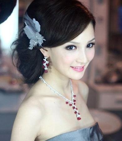 斜边刘海搭配蓬松卷盘发,银色系发饰与同色抹胸礼服完美结合,淡雅华贵