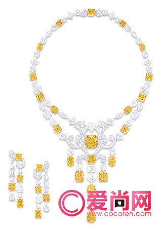 这一套多形切割黄钻及白钻项链及耳环,闪烁着纯净的光彩。柔美的线条,钻石间的相互点缀,都是那么完美。优雅的格拉夫珠宝弃用传统的密钉镶法,独立镶嵌每一颗美钻和宝石,令表面触感平滑,形态更立体玲珑。