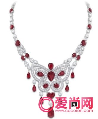 红宝石及钻石蝴蝶形状项链,鲜艳的红宝石散发着迷人的宝光,美丽的蝴蝶在其间偏偏飞舞。可以想象这样的项链戴于颈间是一道多么耀眼的风景。红宝石共重62.59克拉,钻石共重25.29克拉。