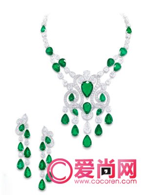 这套梨形祖母绿及多形切割钻石项链及耳环,浓艳深邃的祖母绿闪烁着犹如大自然的点点宝光,轻柔温婉。大小色泽均匹配无比的梨形祖母绿配以不同形状钻石。典雅的祖母绿切割蓝宝石与不同形状的钻石互相辉映,闪烁动人。祖母绿共重74.85克拉钻石共重53.67克拉。