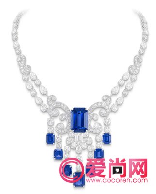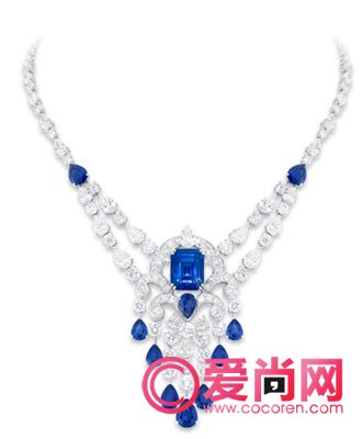 多形切割蓝宝石及钻石项链,以钻石为主,蓝宝石起着点缀的效果,古典的风格围绕着奢华的氛围。蓝宝石及钻石项链和耳环,高贵的蓝宝石绽放这动人的美态,在颈间闪烁着华丽的光彩,与耳环搭配的效果就更不用说了。蓝宝石共重67.30克拉,钻石共重49.68克拉。