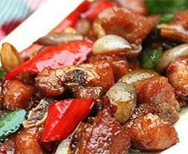 此菜色泽红艳,肉质松软,葱香入味,宜于下酒。