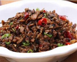 2、中火烧热油,蒜末尖椒煸香,放肉末炒香,带肉末炒熟后,倒入外婆菜翻炒均匀