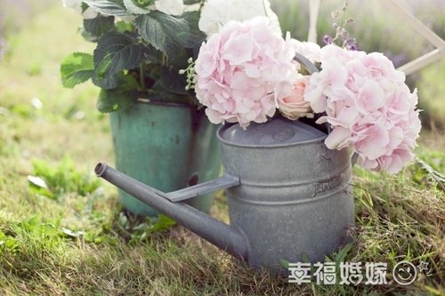 用废旧的小水壶做花瓶,搭配着带着嫩绿叶子的小盆栽,这真真是一场回归大自然的婚礼。