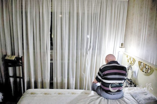 科斯独自坐在床上。照顾老年痴呆病人给照顾者身心都造成很大压力。