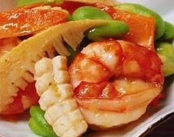 1.鱿鱼去除内脏,,用水冲洗干净,切花刀备用,虾去壳去泥线在背上切一刀,注意不要切断,蚕豆剥出来,胡萝卜、春笋分別洗净,切片备用;