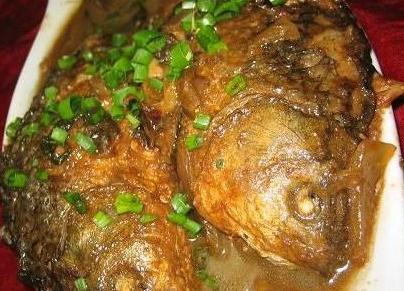 3、炒锅上火,下猪油50克,烧至七八成热,将鲫鱼放入锅内,两面煎至发黄时,下葱结、姜片,煎出香味,再下绍酒、酱油、白糖、盐、清水250克,用旺火烧开,盖上锅盖,改用小火焖烧20分钟左右,再用旺火将卤汁收浓,用湿淀粉少许勾芡,浇上熟猪油25克,撒上葱段,起锅装盘即成。