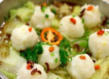 5. 锅中放半锅冷水,左手捞一把鱼胶,随即将左手掌摊开,右手拿只小肉丸放在左掌心里,随左手捏拢,并将大拇指和食指松开,使鱼胶包裹住小肉丸后从大拇指缝中捏出肉馅鱼丸;