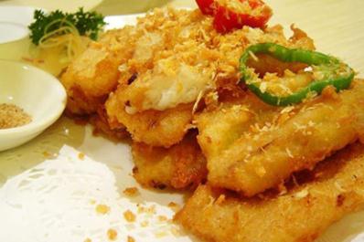 4. 锅置旺火上,下花生油烧至五成热时将煨好的肚尖逐块滚匀面粉,再挂蛋面糊,然后下锅炸呈金黄色时捞出;