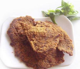 5.约2小时后,即行出锅,置筛子上冷却。然后放入铁筛上进入烘灶,在45至50℃温度经过3个小时烘烤。烘烤时要上下反复调动,使每片牛肉干度均匀。取出即成牛肉片。