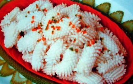 2)、5厘米宽的长方块,放入碗内加精盐1.5克,再加湿淀粉30克上浆拌匀。大蒜头拍碎成泥,放入碗内加绍酒,味精和盐1克,湿淀粉20克调成芡汁待用;
