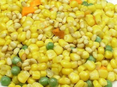 1)鱼肉切成绿豆大小的鱼米,松子用温油炸熟;