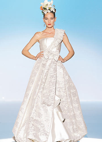 光洁亮缎与印花亮缎相搭,不同光感的面料塑造出宫廷感十足的公主裙摆,腰间的蝴蝶结装饰与单肩褶皱将甜美大气升级。