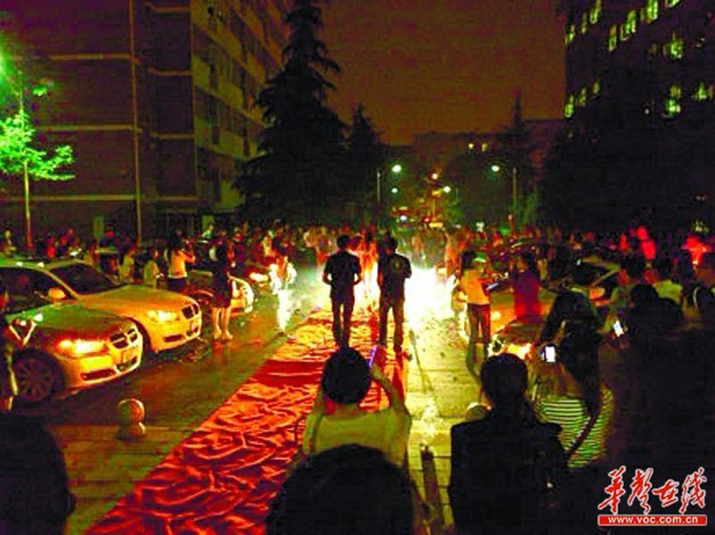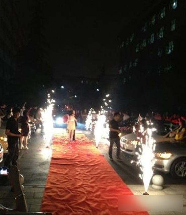 晚上7时40分, “怎么忽然来了这么多豪车?”11辆宝马齐刷刷开到了湖南师范大学木兰路学生公寓前停下,正在公寓门前的黎同学觉得很新奇。7点48分,车上下来几个人,在他们的现场指挥下,11辆宝马开始缓慢地调整队形,10辆宝马排成两排,1辆宝马停在中间,车头正对公寓大门。随后,车队的人搬出音响,接通电源,开始调试音乐。车上的几个人搬下了一条红地毯,从停放在中间的宝马处一直铺到公寓门口,一名男子手捧玫瑰站在红地毯一端。图为求婚现场。