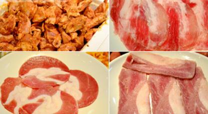 烤肉区:牛肉、五花肉、肥牛、羊肉、甜不辣、烤肠、鳕鱼、鸡翅、鸡胸脯肉、鸡心、鱿鱼……