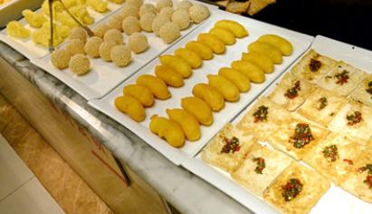 小吃西点区:蒸饺、烧麦、小笼包、玉米、粽子、春卷、雪媚娘、蛋挞、果酱筒、曲奇饼干、蛋糕、桃酥……