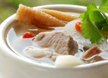 6、加入去皮、切成滚刀块的山药,大火烧开后,改中水,炖至山药熟烂,加入盐、鸡精调味即可