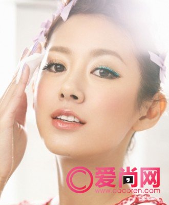 以耀眼金棕眼影打底,接着用眼影刷蘸水后湿用眼影粉,勾勒一条较粗的薄荷绿眼线,最后沿睫毛根部勾勒黑眼线即可。