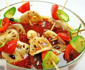 5、将黄瓜片、甜椒、藕片、鸡肉片、鹌鹑蛋依次用竹签串好。