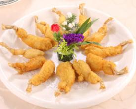 4. 将牛蛙腿放入蛋豆粉中拌匀,入五成热的油锅中炸至断生捞出;