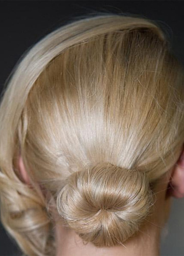 将小马尾拧转成圆形发髻,略微留出一点碎发制造蓬松的效果。